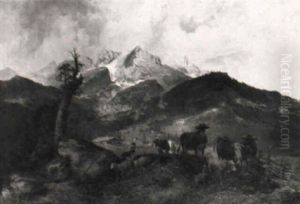 A Herder With Sheep And Cattle In An Alpine Landscape