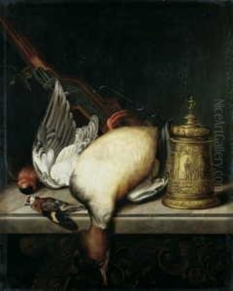 Paar Jagdstilleben Mit Erlegtem Wild, Gewehren, Einem Silbervergoldeten Deckelhumpen Und Einem Krug.