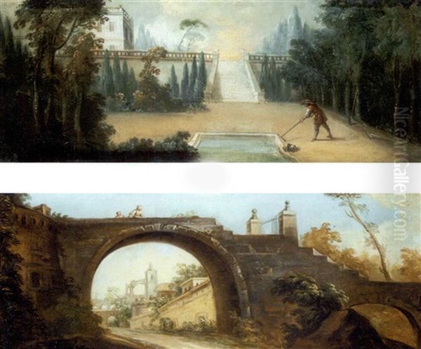 Escena De Calle Con Figuras Sobre Un Puente Y Edificios Al Fondo (+ Escena Con Un Jardinero Trabajando Junto A Un Estanque En Los Jardines De Un Palacio; Pair)
