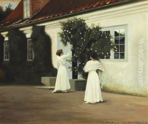 Two Young Girls In A Landscape, One Gathering Roses In Her Apron