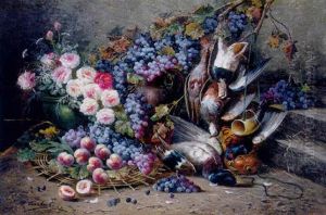 Roses, Tulips And Other Flowers On A Sculpted Plinth, With A Nest And Peaches And Grapes In A Wicker Basket