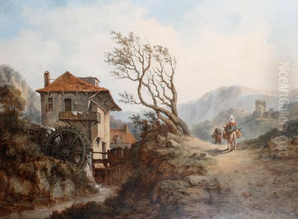Travellers on a road by a watermill