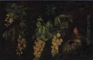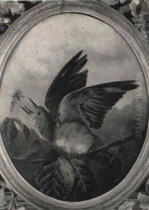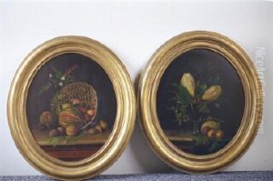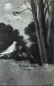 Grapes, Plums With A Pear, A Dish Of Peaches And A Pomegranate With Birds On A Ledge