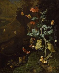 Still Life With Fruit Around A Stone Bass Relief, With A Green Anole Lizard In The Foreground