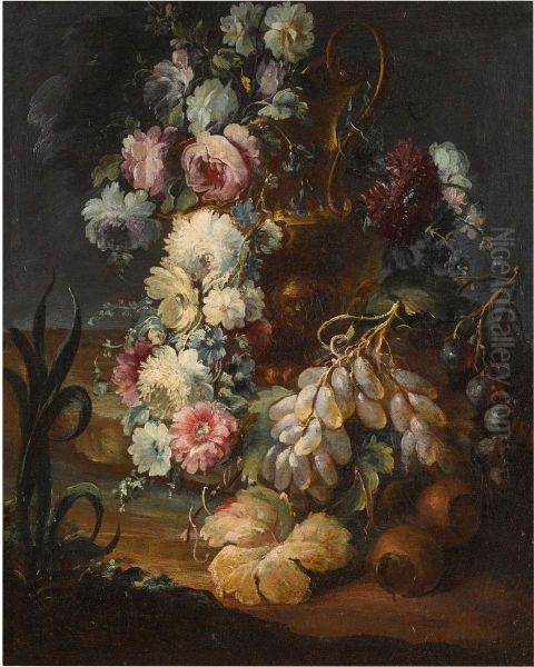 STILL LIFE OF FLOWERS IN A SCULPTED VASE WITH GRAPES AND OTHER FRUIT