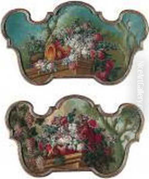 Still Lifes Of Summer Flowers And Grapes In An Urn On A Stone Ledge