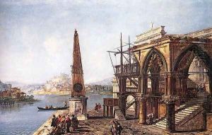 Capriccio of classical monuments obelisk with soldiers by a Pool and Mountains beyond