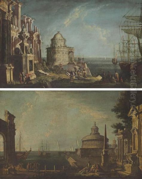 A Capriccio With A Temple And Elegant Figures By A Harbor; And Acapriccio With The Mausoleum Of Hadrian And An Obelisk With Figureson A Quay