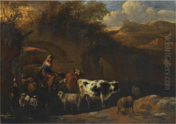 A Shepherdess With Her Herd Fording A Stream In An Italianate Landscape
