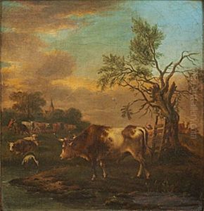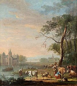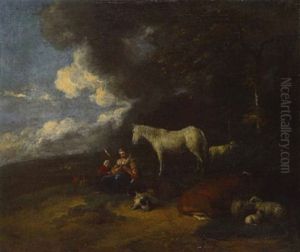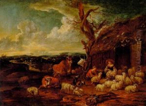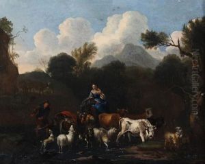 Cattle, Goats And Sheep Grazing In A Landscape With Figures By A A Ruin Beyond