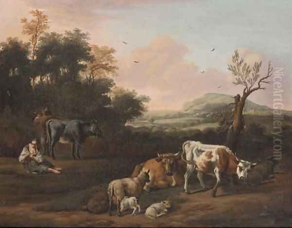 A drover, cattle and a shepherdess in an extensive landscape