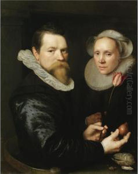 A Double Portrait Of A Husband And Wife, Both Half-length, He Holding A Tulip And A Bulb, A Selection Of Shells On The Shelf Below