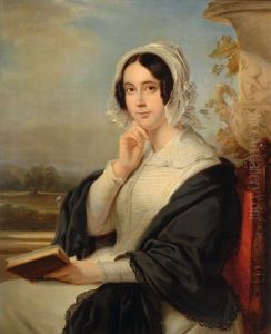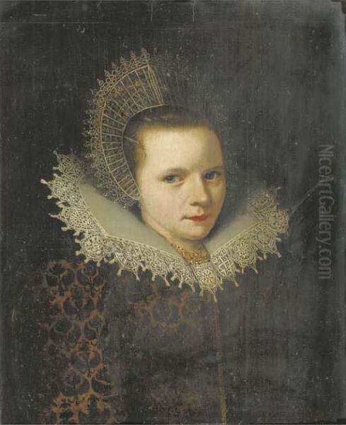 Portrait Of A Lady, Bust Length, In A Brown Velvet Dress With Afloral Pattern And A White Lace Collar, A Gold Necklace, And Awhite Lace Cap Fastened By A Pearl Pin