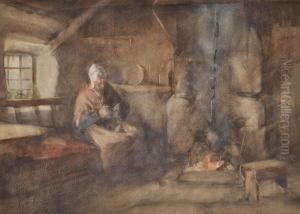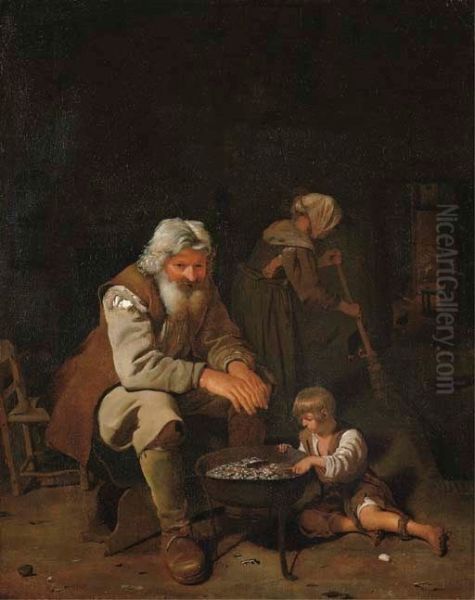 Interior with an old man and a boy by a fire pit and a woman sweeping the floor (Allegory of Winter)