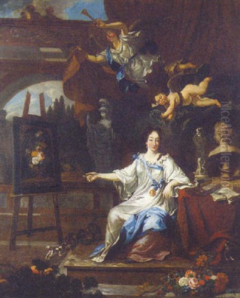 An Allegorical Portrait Of An Artist (rachel Ruysch?) With A Paintbrush Before An Easel, An Angel Blowing A Horn With A Putto Holding A Laurel Wreath Above