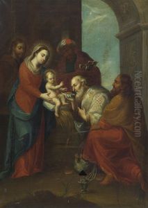 Apostol Santiago Adorando A La Virgen Con El Nino En La Columna, Sobre Un Fondo De Paisaje Con Una Ciudad Y Un Grupo De Peregrinos