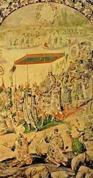 One of a pair of panels depicting the encounter between Hernando Cortes 1485-1547 and Montezuma 1466-1520 Montezuma and his followers