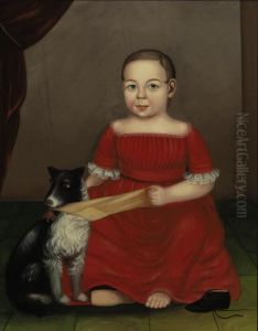 Portrait Of A Child In Red; Dog Pulling A Yellow Stocking