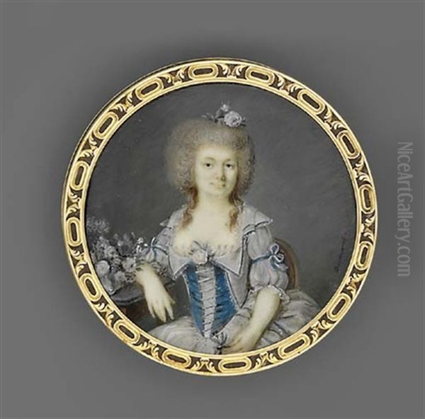 A Young Lady, Seated With Her Right Arm Resting On A Table Beside An Arrangement Of Flowers