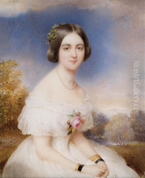 Bildnis Einer Jungen Dame In Weisem Kleid, Mit Einer Rose Am Dekolletee, In Einer Praterlanschaft Sitzend