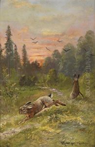Fluchtendes Rotwild Auf Einer Lichtung, Links Ein Mann Mit Erhobener Hand