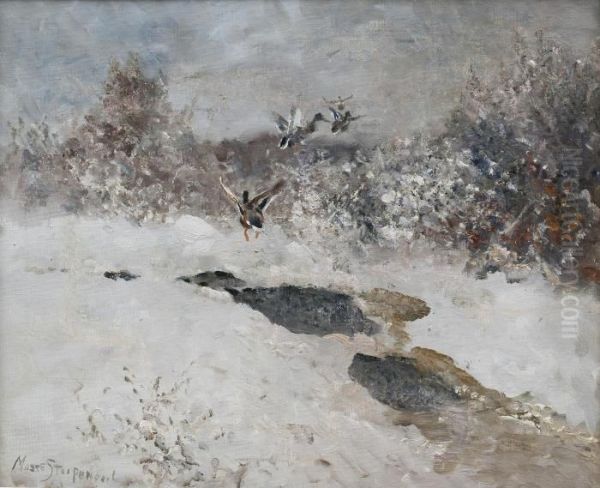 Bring the timeless beauty of Mosse Stoopendaal's Flying Mallards. into your home with a handmade oil painting reproduction. Carefully recreated on canvas by skilled artists using traditional techniques, this piece captures the delicate brushwork, subtle light, and vibrant color of the original masterpiece. With museum-level quality and rich texture, it brings elegance and artistic depth to any space. Enjoy free shipping and make this masterpiece a part of your personal collection.