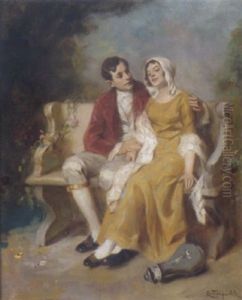 Et Ungt Par I En Skov, Den Unge Dame Er Klaedt I Hvidt Og Baerer En Rod Parasol