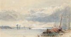 A Shepherd Herding Sheep Beside The Thames At Dusk