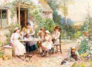 Children Tying Reeds Before A Cottage