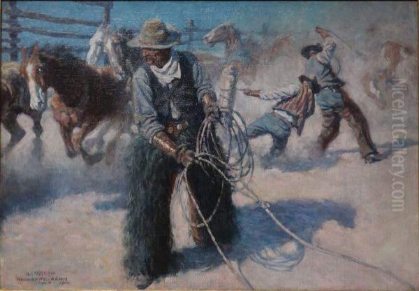 Bring the timeless beauty of N. C. Wyeth's Roping Horses in the Corral into your home with a handmade oil painting reproduction. Carefully recreated on canvas by skilled artists using traditional techniques, this piece captures the delicate brushwork, subtle light, and vibrant color of the original masterpiece. With museum-level quality and rich texture, it brings elegance and artistic depth to any space. Enjoy free shipping and make this masterpiece a part of your personal collection.