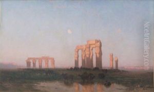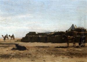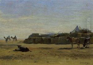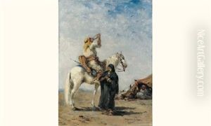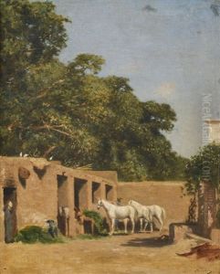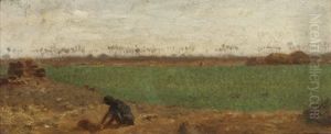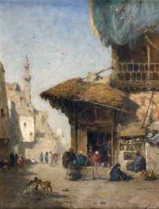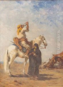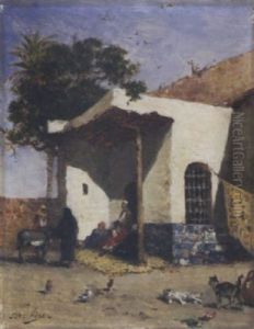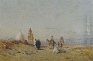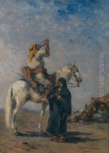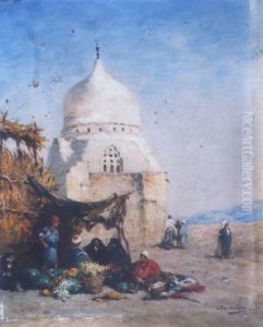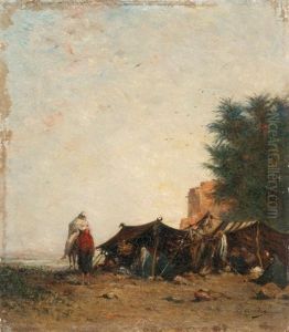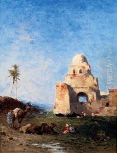 Landschaft Im Orient - Im Vordergrund Ein Am Boden Kauernder Mann, Im Hintergrund Palmen