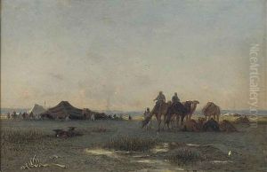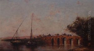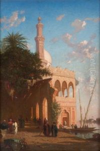 Orientalische Wasserlandschaft Mit Karavane An Einer Brucke
