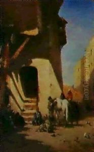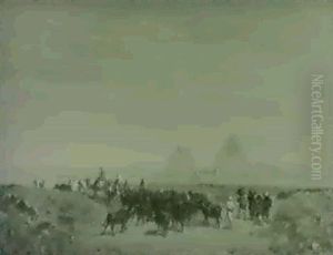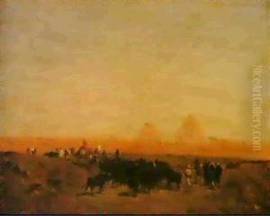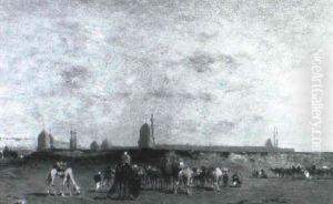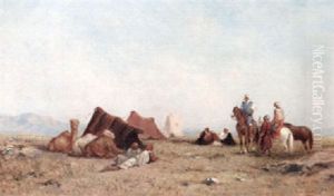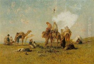 Caravane Au Repos (orientalische Landschaft Mit Ruine, Arabern Und Ruhenden Pferden Und Kamelen}