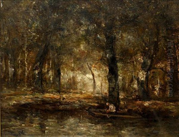Woodland River With Figure In A Punt