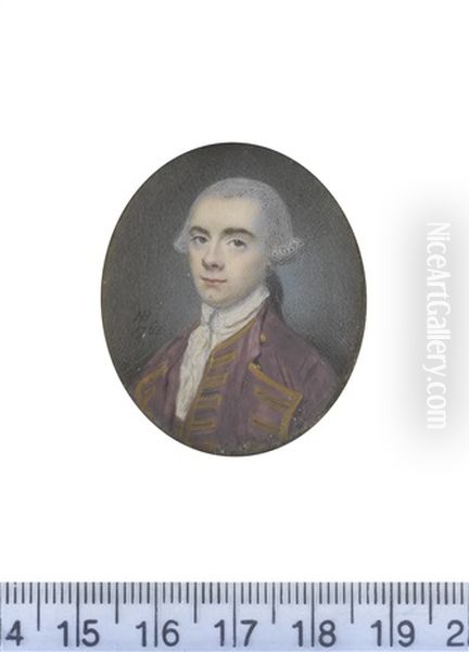 A Gentleman, Wearing Violet Coat Edged With Gold, Matching Waistcoat, White Chemise, Stock And Frilled Cravat, His Powdered Wig Worn En Queue And Tied With A Black Ribbon Bow