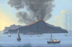 An English merchantman lying at anchor in the Bay of Naples with Vesuvius erupting beyond (illustrated)