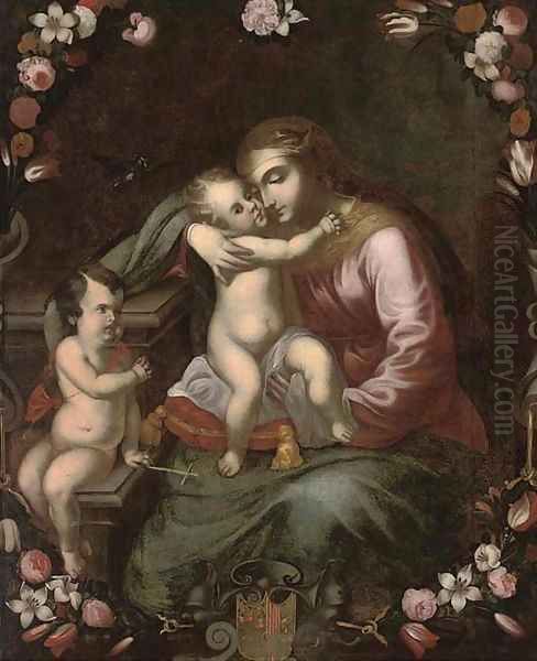 The Madonna and Child with the Infant Saint John the Baptist surrounded by a floral cartouche