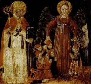 Predella: Ein Engel beschutzt zwei Dominikaner-Monche auf ihrer Reise
