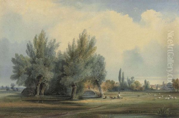 A Landscape In Northern France With A Shepherd And His Flock Beneath Pollarded Willows