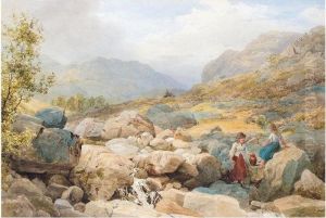 Two Women Drawing Water From A Well Before Ruins