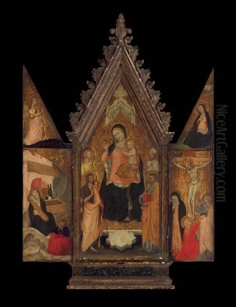 A Portable Triptych: The Madonna And Child Enthroned With A Female Saint, Saint John The Baptist, A Bishop Saint, And Saint Peter; On The Wings - The Nativity With The Angel Of The Annunciation On The Pinnacle Above; And The Crucifixion With The Virgi