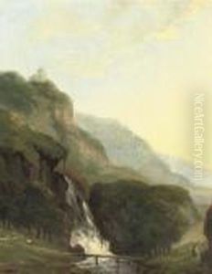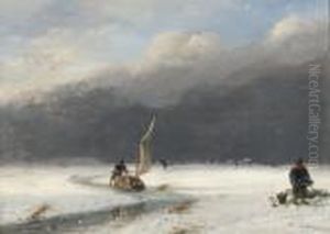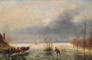 Idyllische Hollandische Winterlandschaft Mitschlittschuhlaufern Und Bauer, Seine Milchkannen In Einem Schlittenziehend