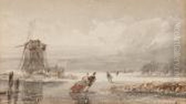 Figures Skating By A Windmill Together With Three Other Coastal And Landscape Scenes, Four