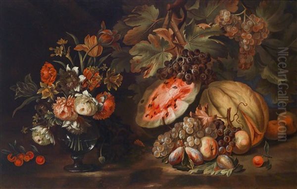 Ein Stillleben Von Blumen In Einer Glasvase Neben Wassermelonen, Feigen Und Trauben Auf Einer Tischkante