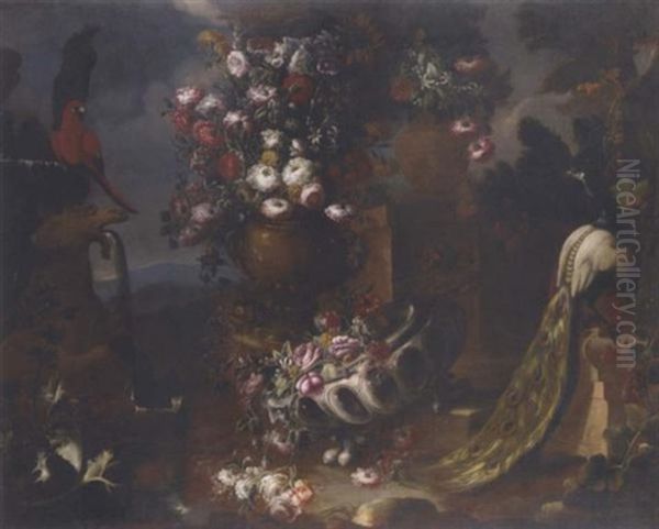 Roses, Carnations, Poppies, Morning Glory, Asters And Other Flowers In Two Urns, A Parrot By A Fountain, A Thistle, A Peacock And A Vine In An Ornamental Garden