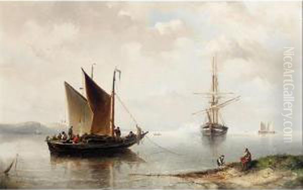 Dutch Estuary Scene With A Man-o'-war Firing A Salute And Fishing Boat In Foreground