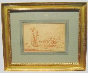 A Wooded Landscape With Drovers Bringing Their Flocks To Water