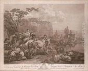 A Shepherd Family With Their Cattle Fording A Stream In Anitalianate Landscape
