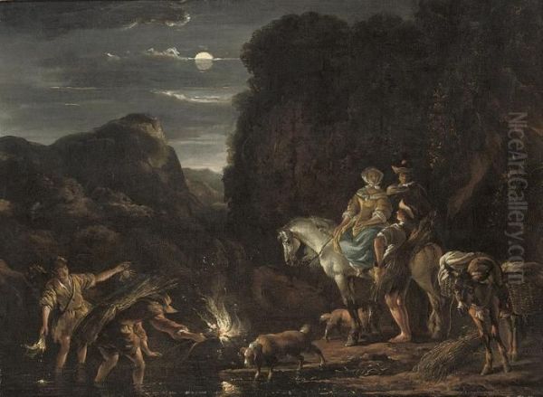 A Moonlit River Landscape With Travellers On Horseback Conversingwith Crayfishers