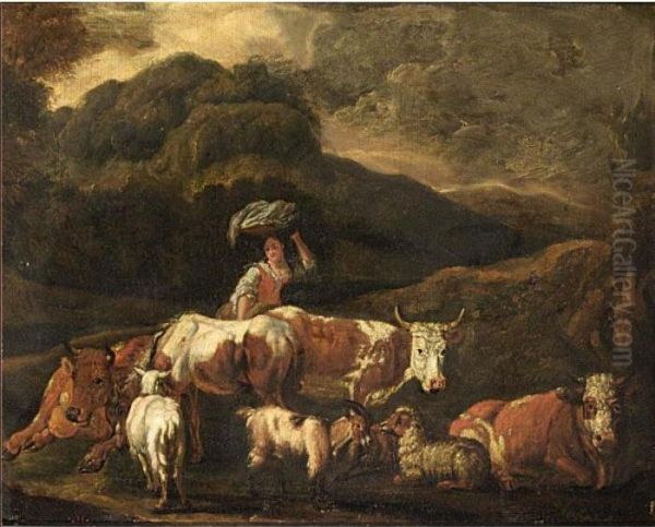 A Mountainous Landscape With A Shepherdess Tending Her Herd